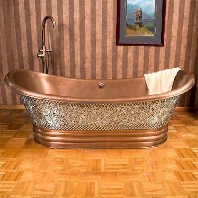 Badkar 222978 från GemLook är ett fristående kopparbadkar i exklusiv och vacker design. Badkar GemLook 222978 har en antikbehandlad yta med en utsida med vacker spegelmosaik. Badkarets kortsidor är lite längre för att du ska får ett bekvämt och välgörande bad. Små variationer i ytbehandling och mått (± 2 cm) kan förekomma.