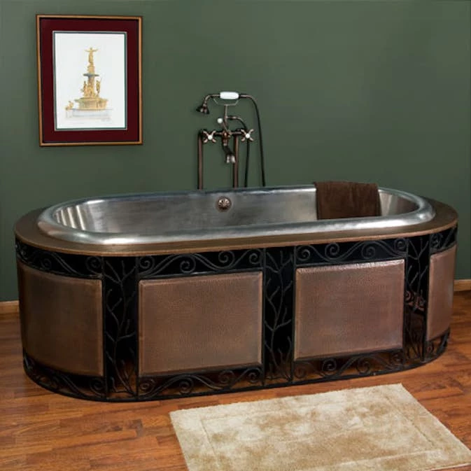 Badkar 258881 från GemLook är ett fristående kopparbadkar i en unik design. Badkar GemLook 258881 har en ställning av smitt järn med koppardetaljer. Badkarets kopparytor har en antikbehandlad yta. Badkaret har en förnicklad, silverfärgad insida. Små variationer i ytbehandling och mått (± 2 cm) kan förekomma.