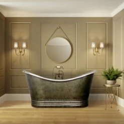Badkar TT-212/66-G från GemLook är ett fristående kopparbadkar i exklusiv Bateau-design. Detta ovala badkar har lite längre och lutade kortsidor med vackra detaljer för att du ska kunna ta ett välgörande och bekvämt bad. Badkaret är gjort av koppar med en mörkare patinabehandling på utsidan och nickel på insidan. Små variationer i ytbehandling och mått (± 2 cm) kan förekomma.