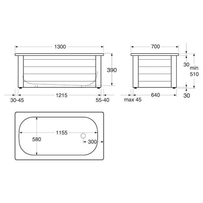 Frontstativet till hel- och halvfrontstativet levereras med gavlarna förmonterade. Front samt dold profil monteras sedan ihop till en ram. Stativet justeras i våg med hjälp av de ställbara fötterna. Badkaret, som är försett med dämp/friktionsmaterial under hörnen, läggs ned i stativet. Utloppsröret av plast kapas och ansluts till golvbrunn. Monteringsanvisning medföljer leveransen.