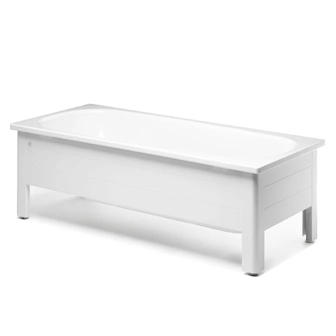 Frontstativet till hel- och halvfrontstativet levereras med gavlarna förmonterade. Front samt dold profil monteras sedan ihop till en ram. Stativet justeras i våg med hjälp av de ställbara fötterna. Badkaret, som är försett med dämp/friktionsmaterial under hörnen, läggs ned i stativet. Utloppsröret av plast kapas och ansluts till golvbrunn. Monteringsanvisning medföljer leveransen.
