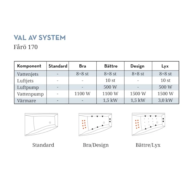 – Vattenmassage- reglerbar ryggmassageintensitet, sidomassage och ev. fotmassage