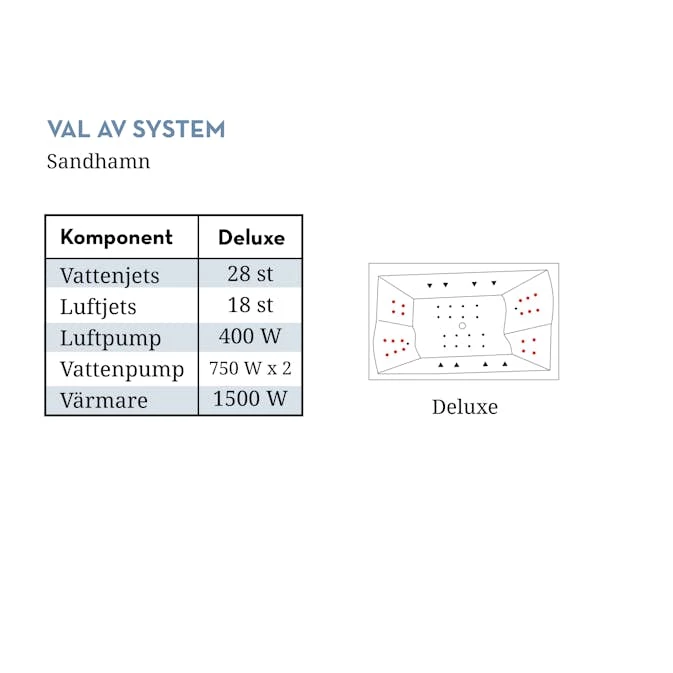 Scala är ett exklusivt massagebad med dubbelt pumpsystem. Utrustat för att möta alla önskemål om ett perfekt hemmaspa. Swebad Sandhamn är stort och exklusivt fullutrustat Deluxe-badkar med allt vad du kan tänkas önska av ett massagebadkar.